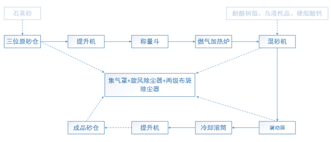 全套設(shè)備由原砂倉、斗式提升機、稱量斗、加熱爐、混砂機、震動篩、冷卻滾筒、成品倉提升機、成品倉等主機,配以全自動控制的電器控制系統(tǒng),氣路、水路、除塵及燃料系統(tǒng)組成一條完成的生產(chǎn)下。